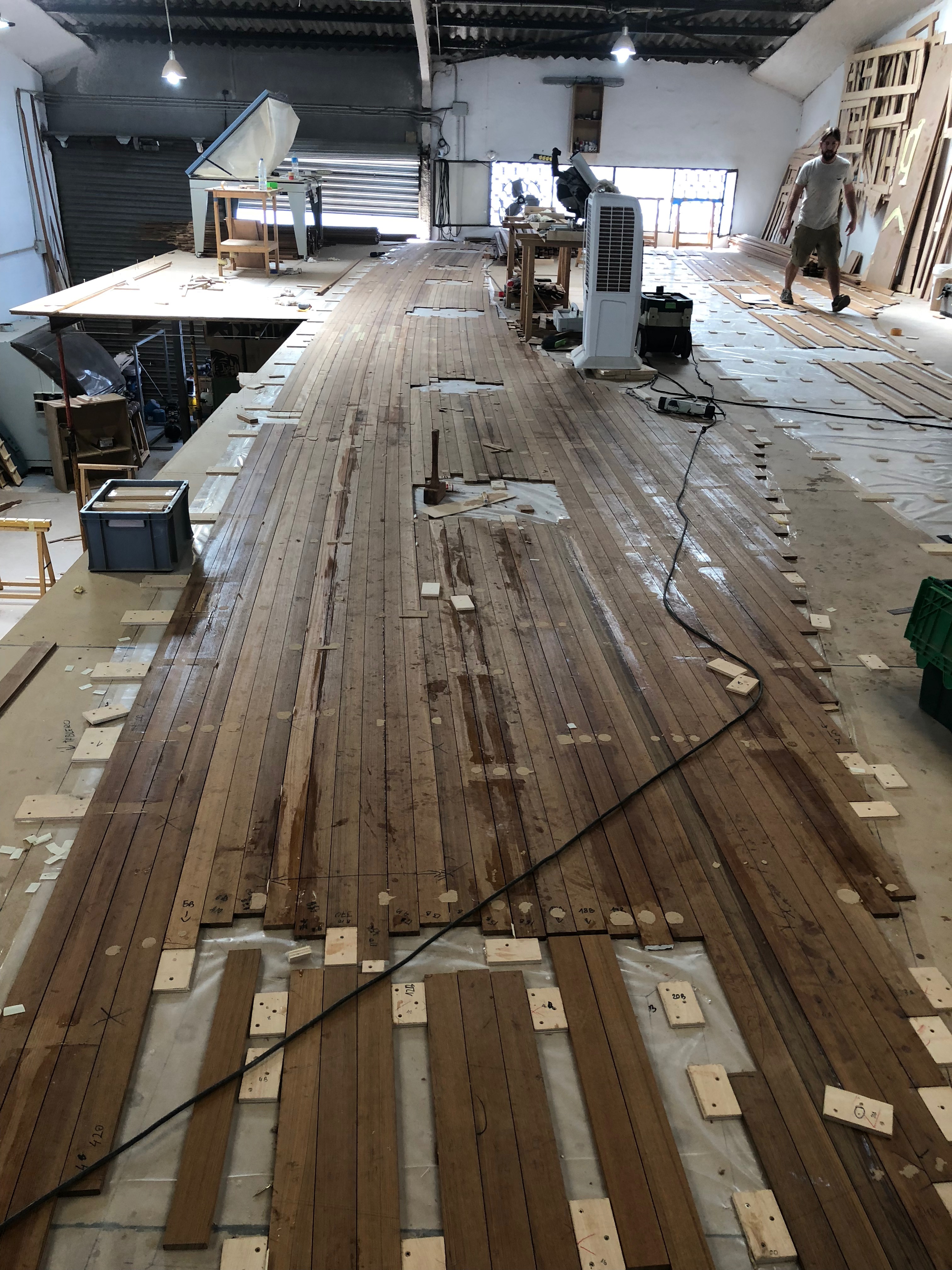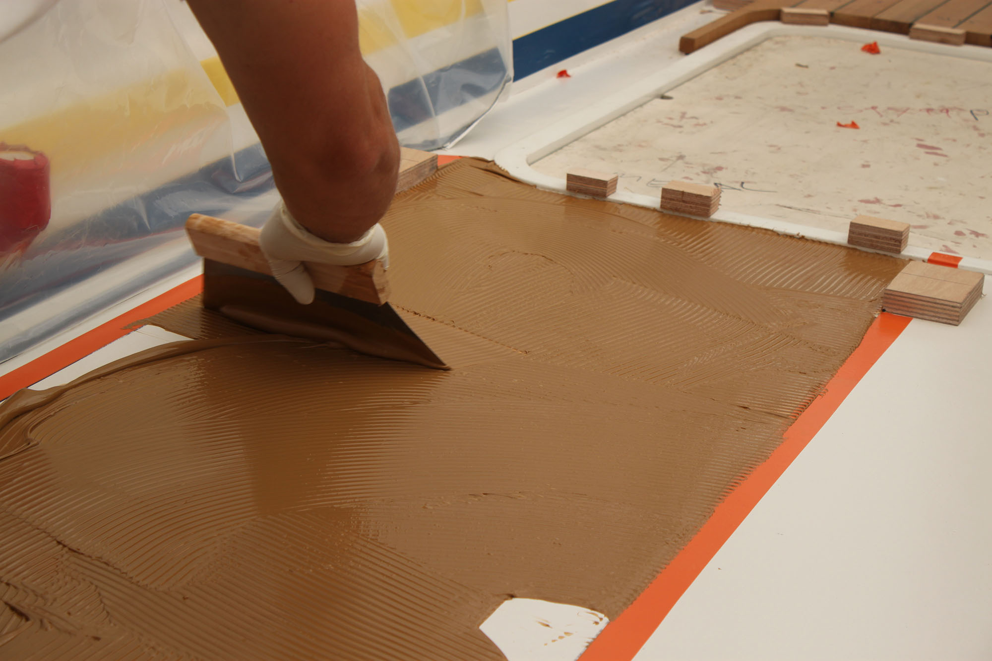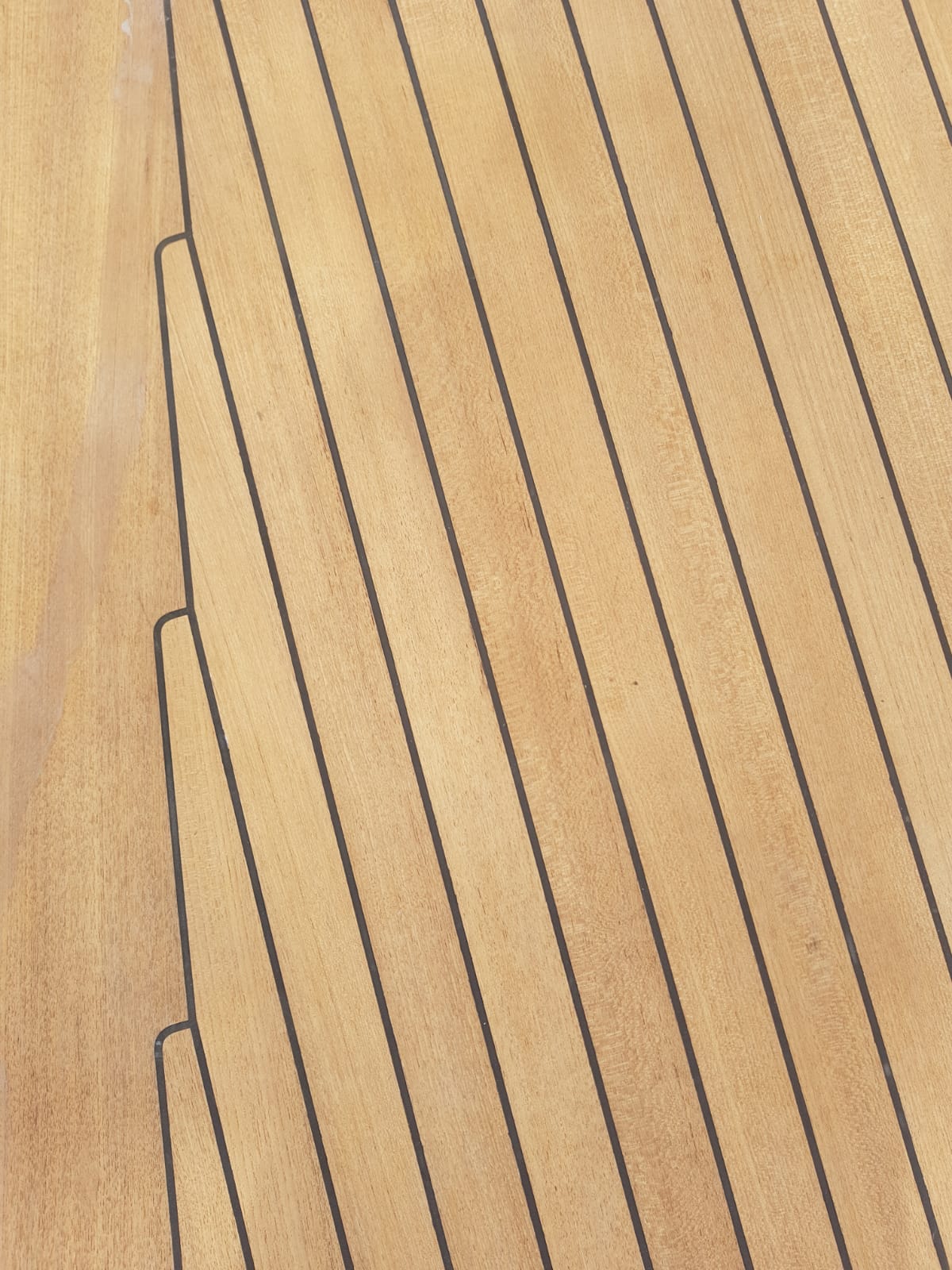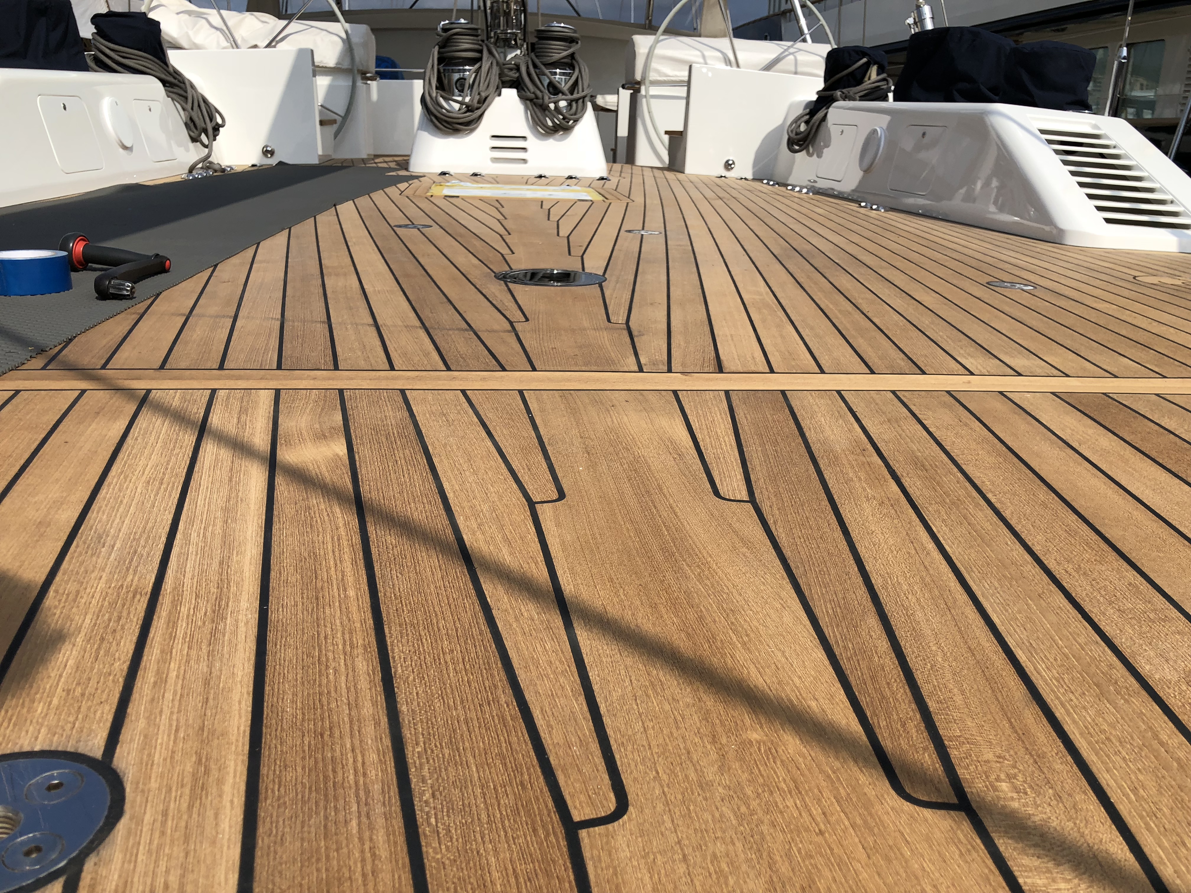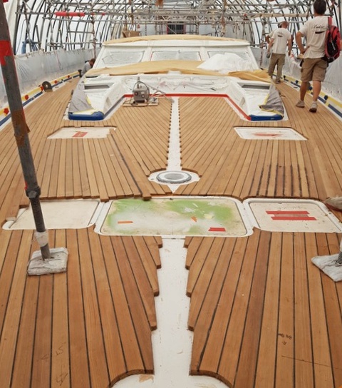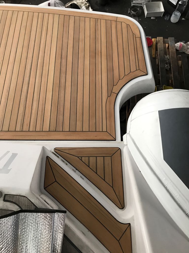 The decks are built in our workshop with the pre-construction system that consists of manufacturing panels and individual sections which allows a quick installation on board. During the installation process, we bond the deck panels directly to the boat, without fiber and plywood underneath, using the vacuum pressing system. At last, we caulk the perimeter and we carry out a superficial sanding of the deck to obtain an optimal finish.