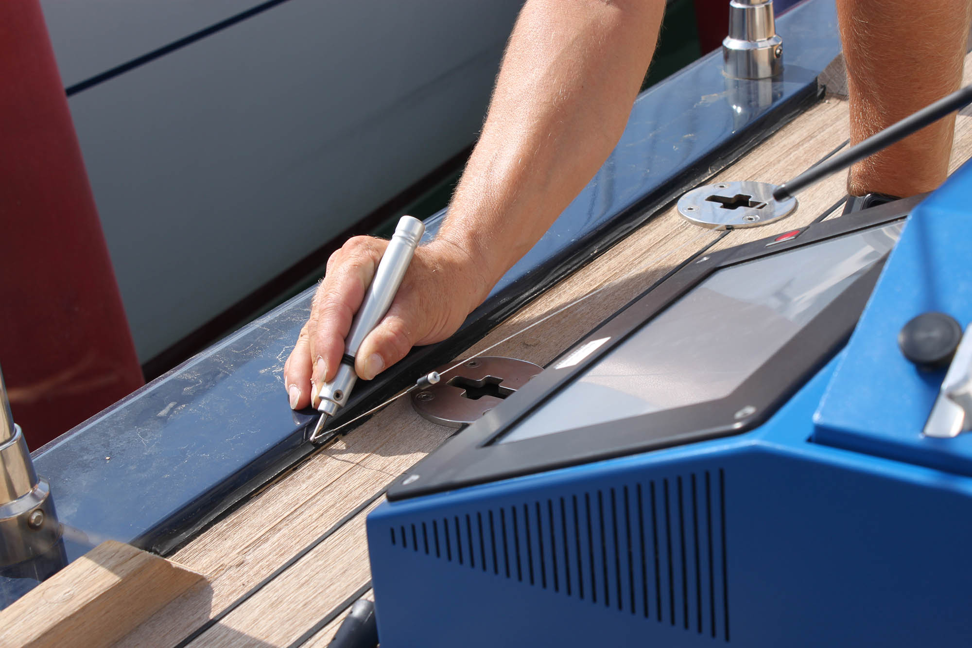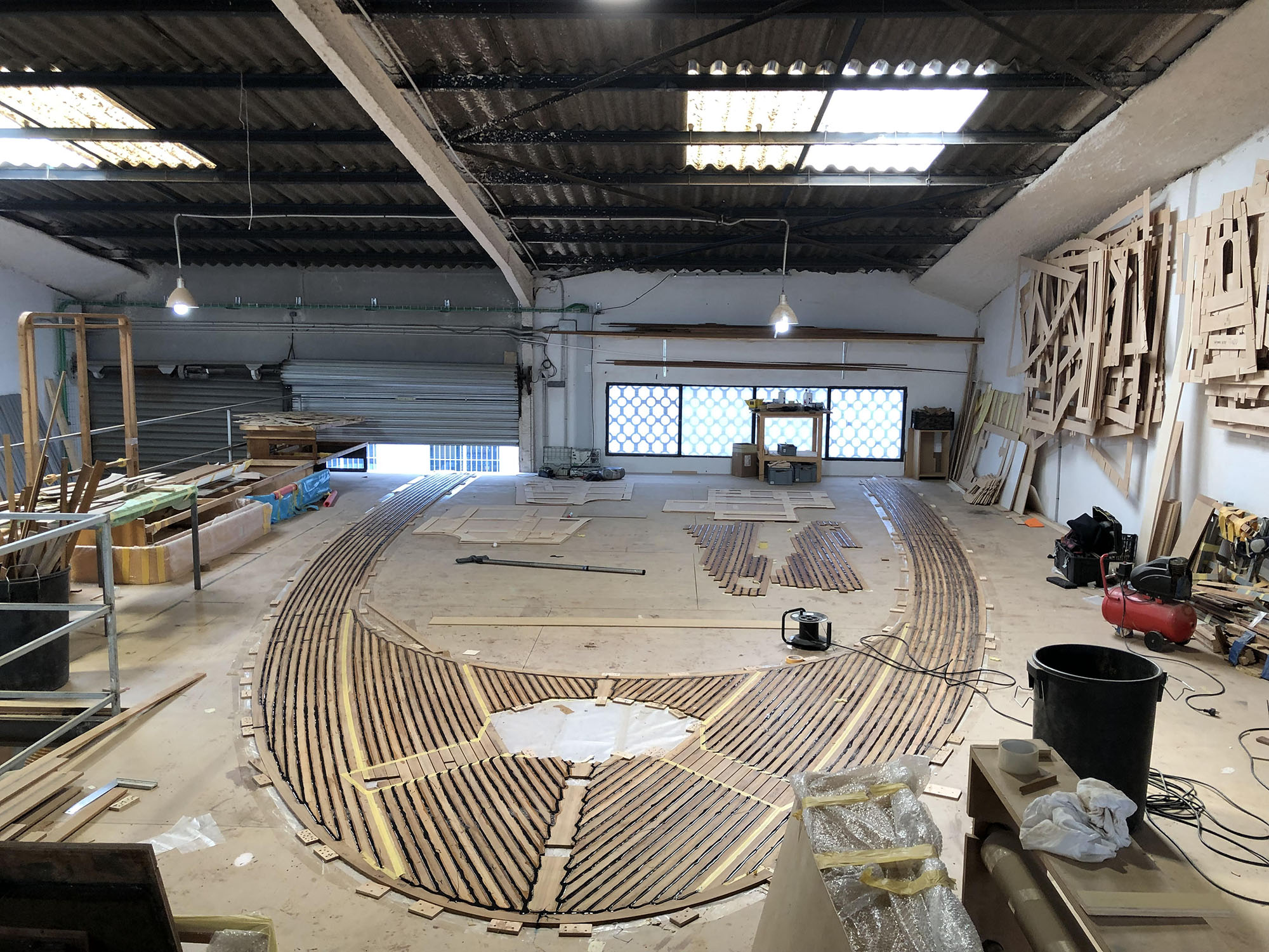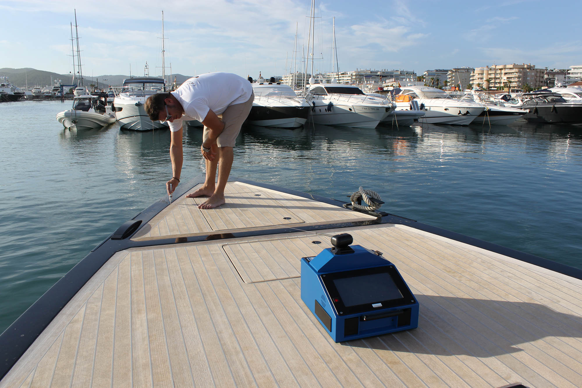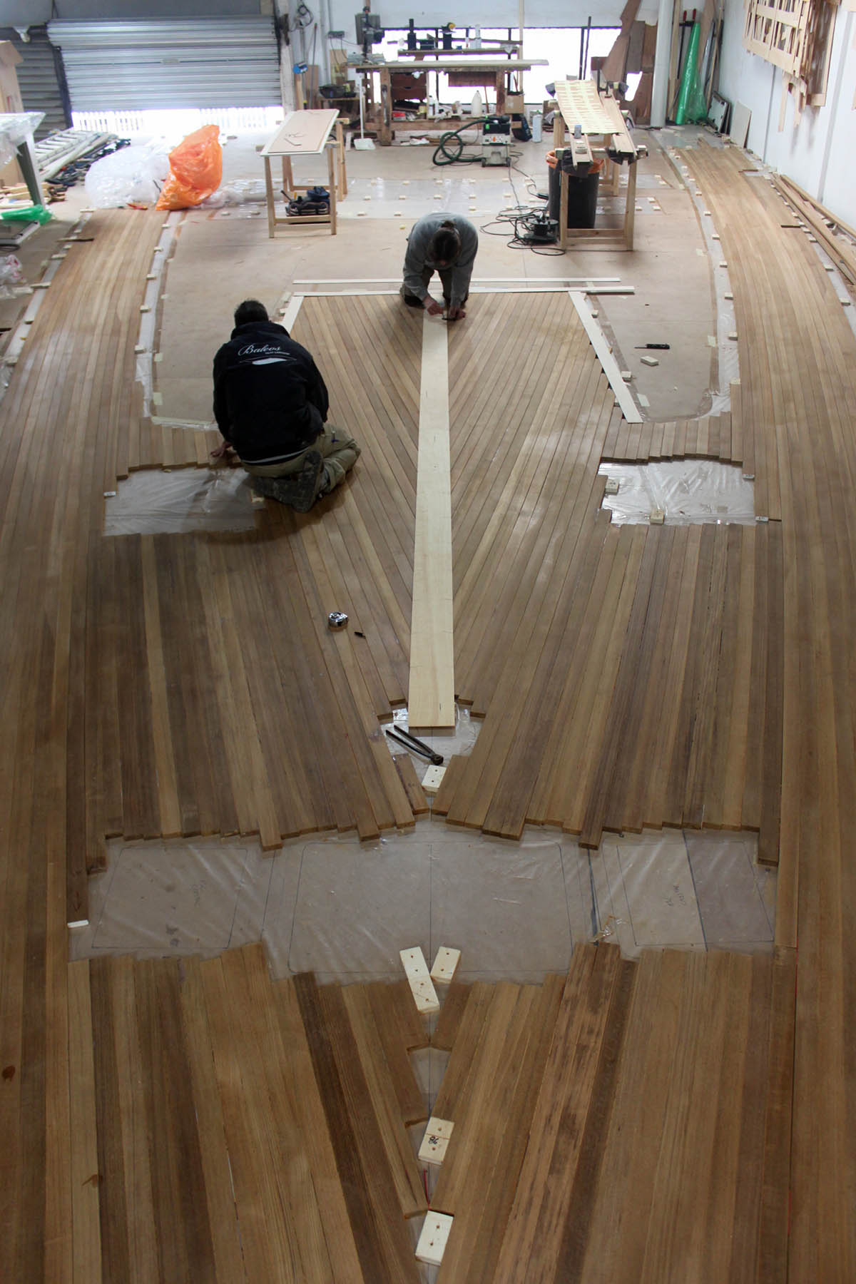 The decks are built in our workshop with the pre-construction system that consists of manufacturing panels and individual sections which allows a quick installation on board. During the installation process, we bond the deck panels directly to the boat, without fiber and plywood underneath, using the vacuum pressing system. At last, we caulk the perimeter and we carry out a superficial sanding of the deck to obtain an optimal finish.